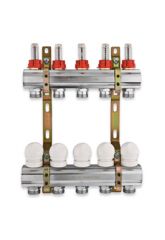 Szerelt osztó-gyűjtők áramlásmérővel, termosztatikus visszatérő szelepbetéttel, kézikerékkel, termosztát fej felszerelési opcióval